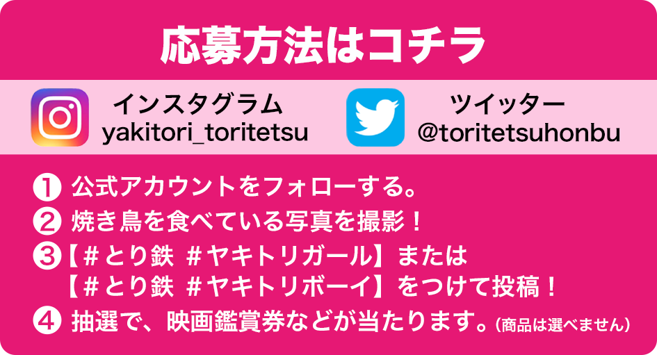 キャンペーン期間中の投稿に#とり鉄 #ヤキトリガールまたは#とり鉄#ヤキトリボーイのいずれかが付いており、かつ写真か動画を投稿しているものに限ります。