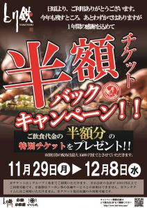 ご飲食代金の半額分を次回使える特別チケットにてプレゼント♪♪