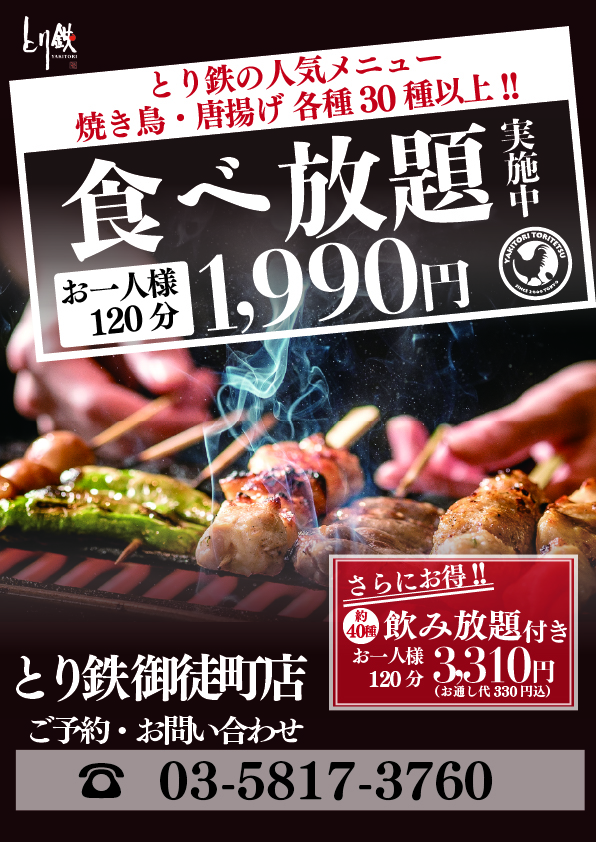 とり鉄御徒町店、食べ放題実施中!!!