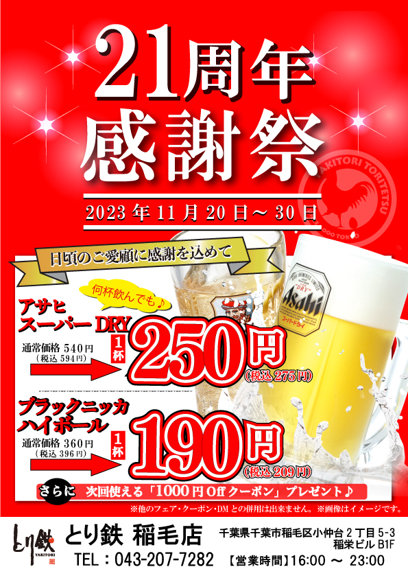 皆様のおかげで、とり鉄稲毛店は21年を迎える事が出来ました‼️