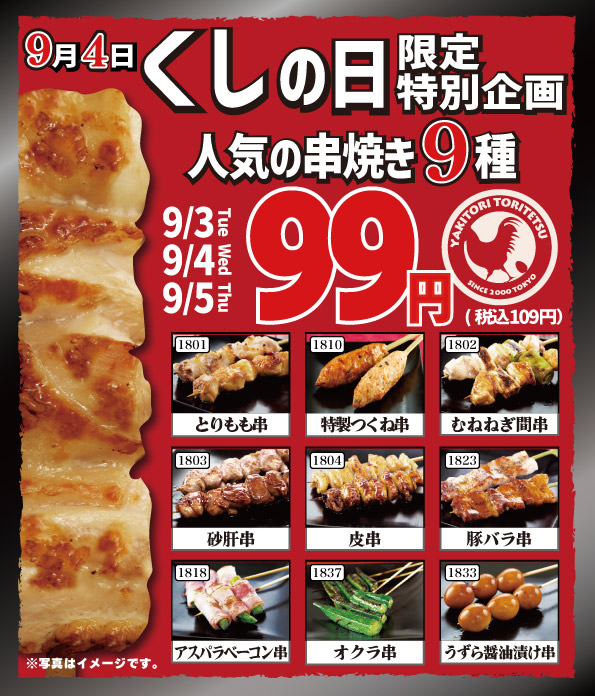 感謝を込めて9月3日~5日の3日間『#串の日』人気の串焼き9種99円で提供