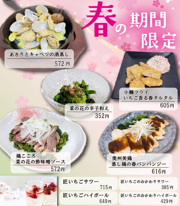 あさりの旨みが染み渡る「あさりとキャベツの酒蒸し」や、春の香りを閉じ込めた「小鯛フライ〜いちご香る春タルタル〜」など、今しか味わえない一皿をご用意しております。