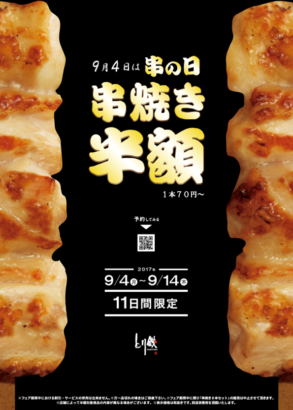 9月4日     そう、9月4日は     『串の日』   『9(く)4(し)の日!!!』       串焼き半額!開催します!   お得な11日♪     ※秋葉原昭和通り店は実施しておりません。 ※その他とり鉄グループの店舗では実施しておりません。     皆様のご来店 お待ちしております(^v^)