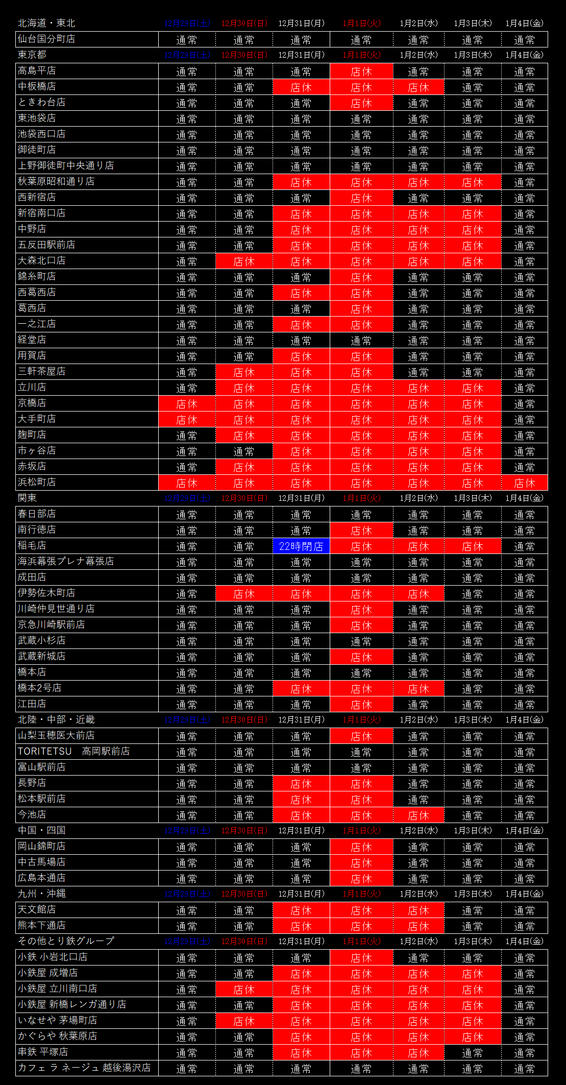 年末年始の各店の営業スケジュールをお知らせ致します。