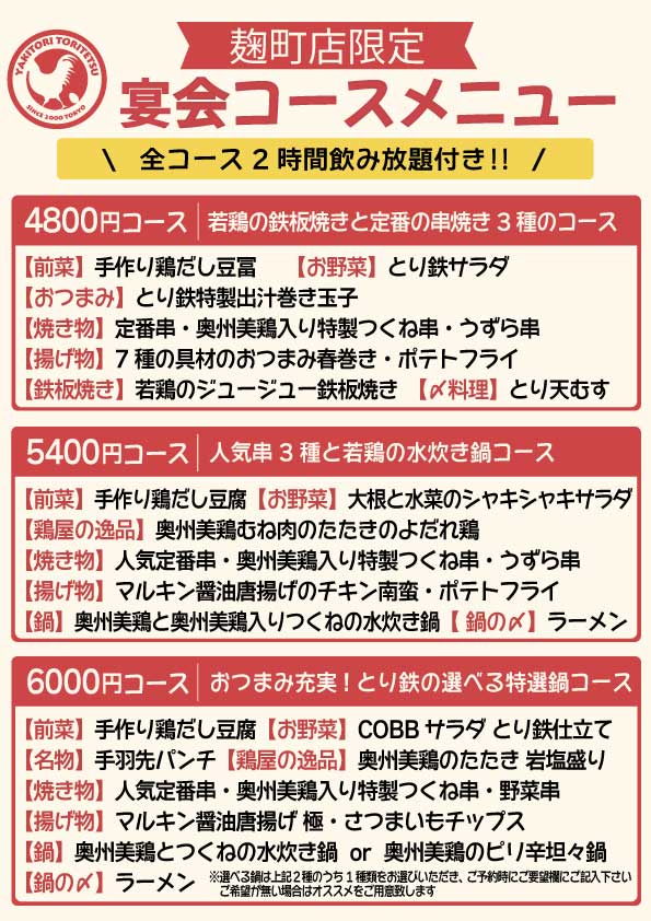 麹町駅 近くの居酒屋で美味しい 焼き鳥 なら とりてつ麹町店がおすすめ。駅2番出口から徒歩1分。鶏料理専門居酒屋として秘伝の技で丁寧に焼き上げる 焼き鳥 と、素材にこだわる鶏料理が自慢。「本当に美味しいものを」「できる限りの低価格で」をコンセプトに日々努力しております。 動物由来のタンパク質を含まないビタミンEを強化した飼料で丹精込めて育てた「楽美鶏(らくみどり)」の 焼き鳥 をはじめ、様々な調理法で提供される希少な「純種の鳥骨鶏(うこっけい)」、全飼育期間無薬飼料で飼育したきめ細かく歯ごたえのある肉質のオリジナル鶏「奥州美鶏(おうしゅうびどり)」を中心とした鶏料理と豊富な種類のお酒との美味しいコラボをお楽しみください。ジャズが流れる居心地良い空間は、気の合う仲間同士ワイワイ盛り上がれることはもちろん、お一人様、カップルや少人数のグループなど様々なシチュエーションでのご利用が可能。 飲み放題付きの忘年会、新年会、歓送迎会、女子会等、各種宴会にもおすすめです。