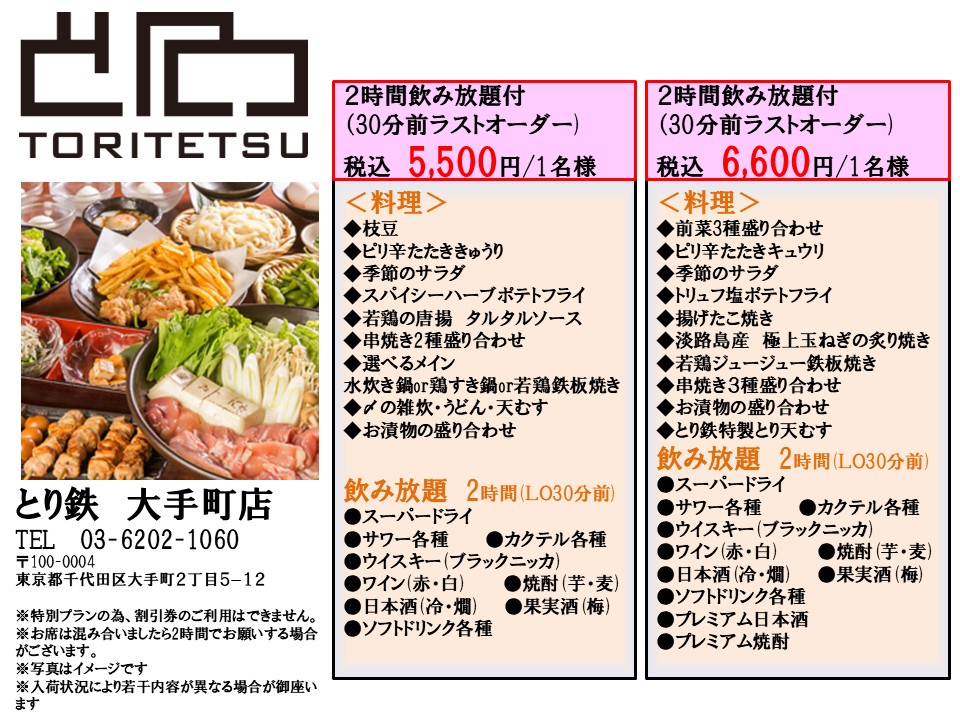 JR東京駅 地下鉄大手町駅 近くの居酒屋で美味しい 焼き鳥 なら とり鉄大手町店がおすすめ。駅から徒歩3分。鶏料理専門居酒屋として秘伝の技で丁寧に焼き上げる 焼き鳥 と、素材にこだわる鶏料理が自慢。「本当に美味しいものを」「できる限りの低価格で」をコンセプトに日々努力しております。 動物由来のタンパク質を含まないビタミンEを強化した飼料で丹精込めて育てた「楽美鶏(らくみどり)」の 焼き鳥 をはじめ、様々な調理法で提供される希少な「純種の鳥骨鶏(うこっけい)」、全飼育期間無薬飼料で飼育したきめ細かく歯ごたえのある肉質のオリジナル鶏「奥州美鶏(おうしゅうびどり)」を中心とした鶏料理と豊富な種類のお酒との美味しいコラボをお楽しみください。ジャズが流れる居心地良い空間は、気の合う仲間同士ワイワイ盛り上がれることはもちろん、お一人様、カップルや少人数のグループなど様々なシチュエーションでのご利用が可能。 飲み放題付きの忘年会、新年会、歓送迎会、女子会等、各種宴会にもおすすめです。 美味しい 焼き鳥 と鶏料理を食べたくなったら是非 とり鉄大手町店にご来店下さい。