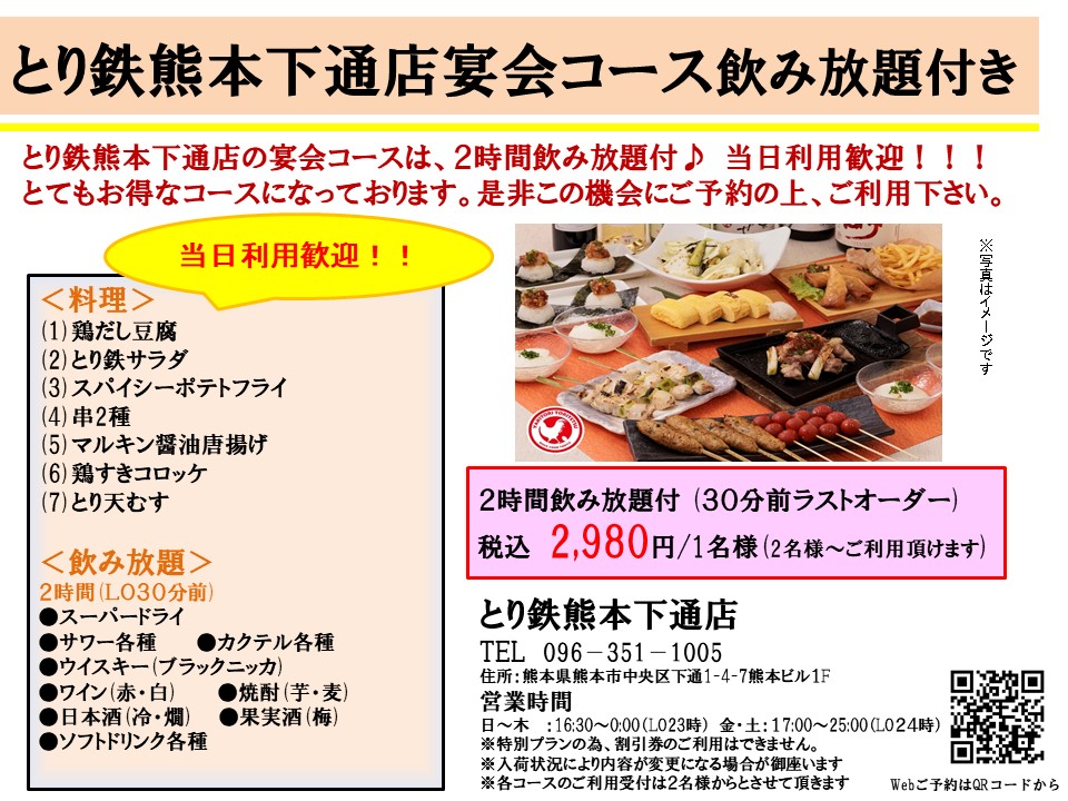 下通り 市役所前駅 近くの居酒屋で美味しい 焼き鳥 なら とり鉄熊本下通店がおすすめ。駅から徒歩2分。鶏料理専門居酒屋として秘伝の技で丁寧に焼き上げる 焼き鳥 と、素材にこだわる鶏料理が自慢。「本当に美味しいものを」「できる限りの低価格で」をコンセプトに日々努力しております。 動物由来のタンパク質を含まないビタミンEを強化した飼料で丹精込めて育てた「楽美鶏(らくみどり)」の 焼き鳥 をはじめ、様々な調理法で提供される希少な「純種の鳥骨鶏(うこっけい)」、全飼育期間無薬飼料で飼育したきめ細かく歯ごたえのある肉質のオリジナル鶏「奥州美鶏(おうしゅうびどり)」を中心とした鶏料理と豊富な種類のお酒との美味しいコラボをお楽しみください。ジャズが流れる居心地良い空間は、気の合う仲間同士ワイワイ盛り上がれることはもちろん、お一人様、カップルや少人数のグループなど様々なシチュエーションでのご利用が可能。 飲み放題付きの忘年会、新年会、歓送迎会、女子会等、各種宴会にもおすすめです。