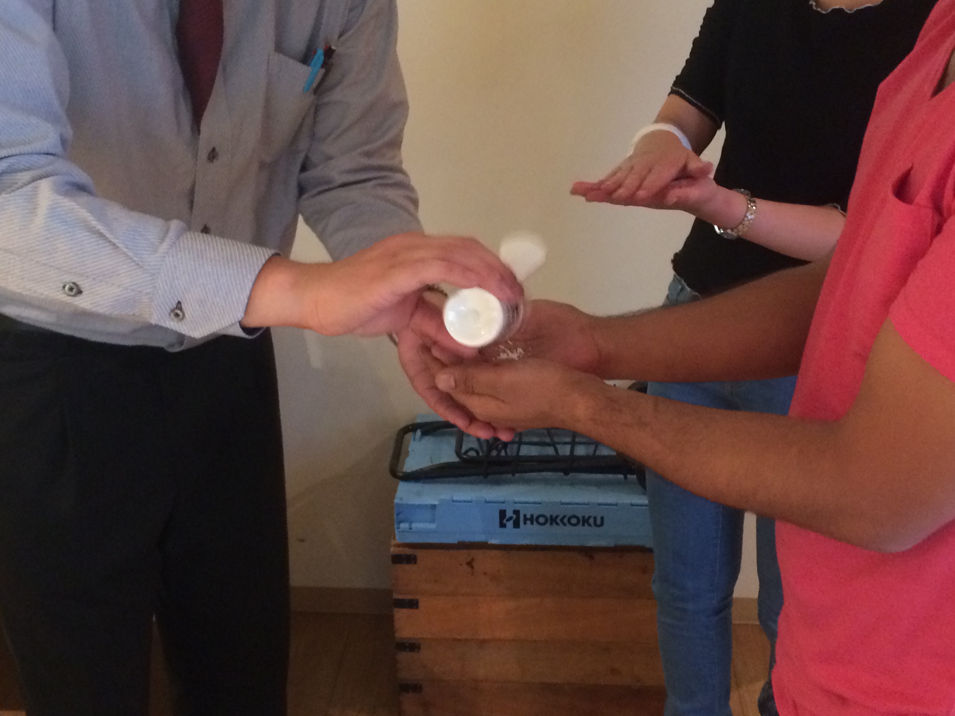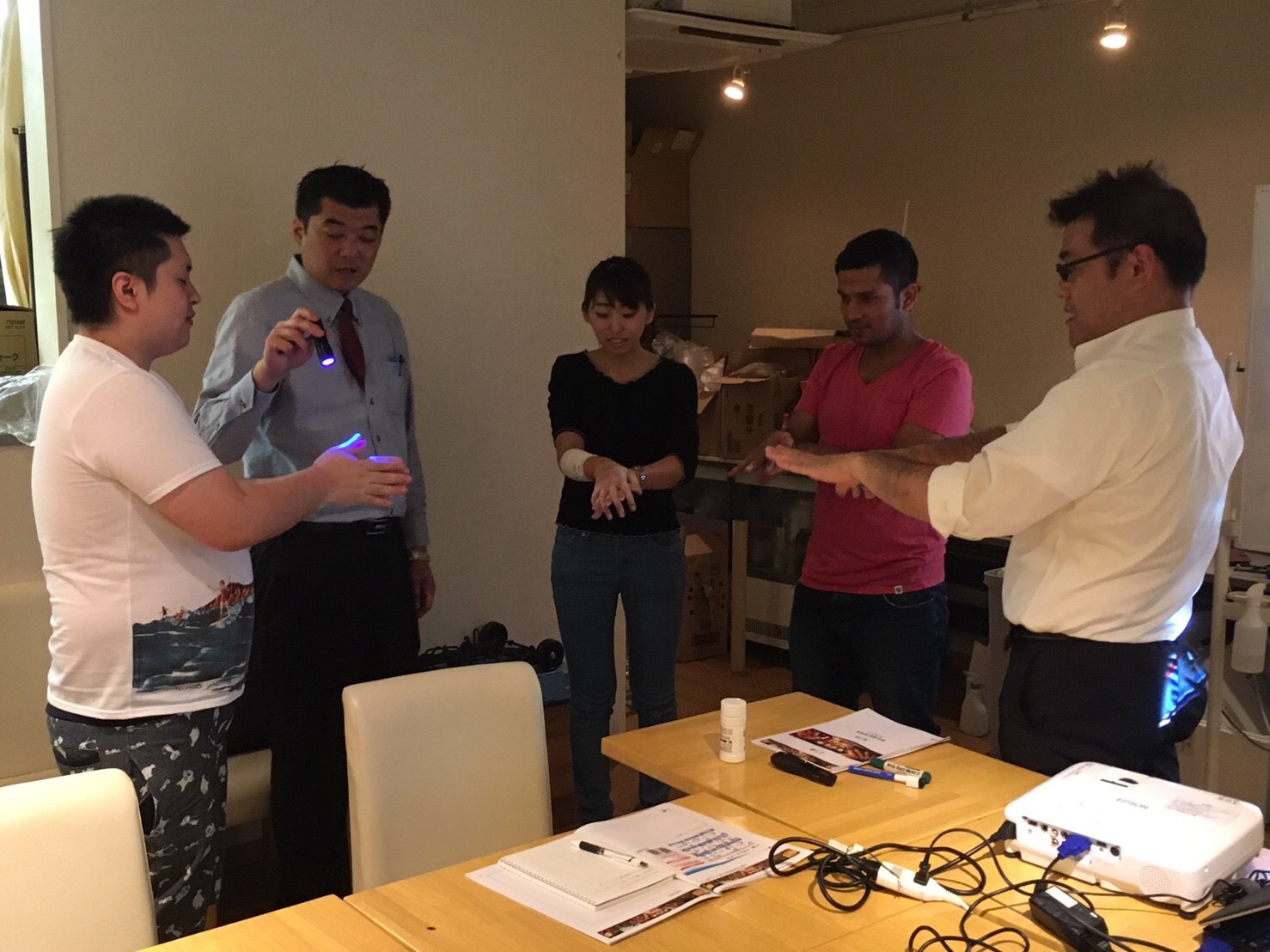 指の股や皺汚れの残りやすい個所や自分の手洗いの癖も理解できる体験型講義でした。