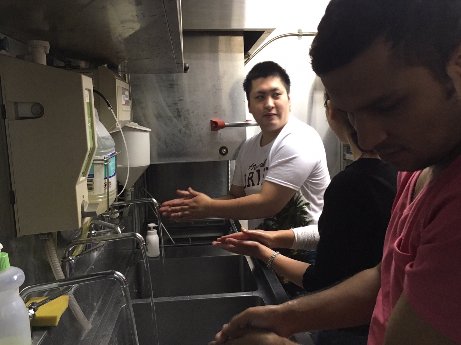 もっとも重要な「手洗いと清掃について」では手洗い講義の1コマ